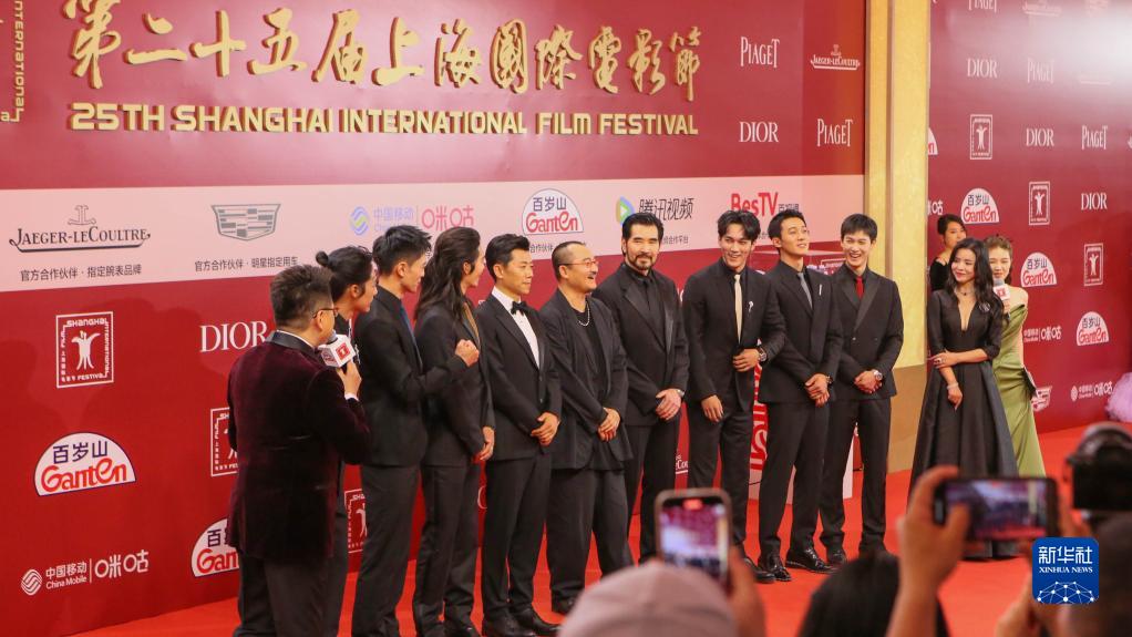 6月9日,金爵獎主競賽單元參賽片《不虛此行》劇組在第25屆上海國際電影節紅毯儀式上合影。新華社記者 王翔 攝