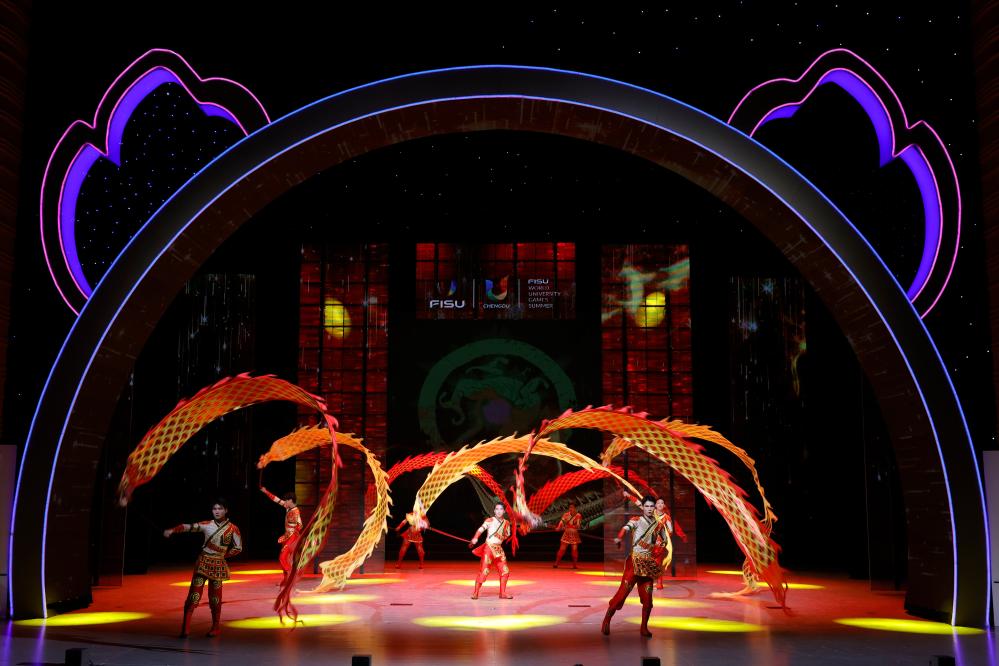 8月6日,來(lái)自成都體育學(xué)院的演員在表演《獅躍龍騰》。新華社記者 沈伯韓 攝
