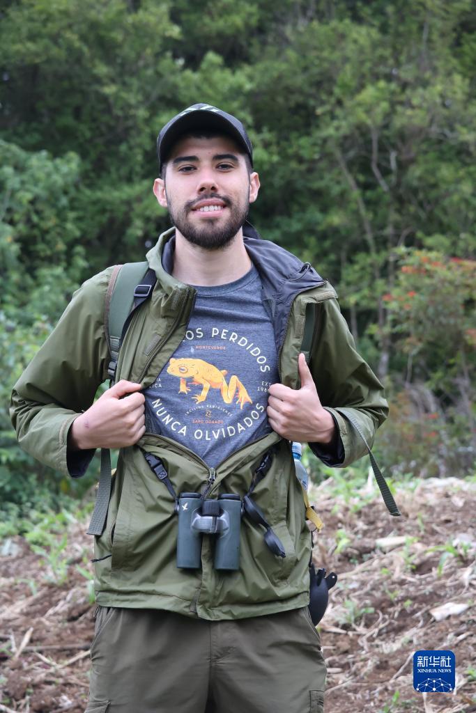 7月23日,哥斯達黎加蒙特韋德云霧森林生物保護區的一名導游展示他身穿的印有金蟾蜍紀念圖案的T恤衫。新華社記者 范小林 攝