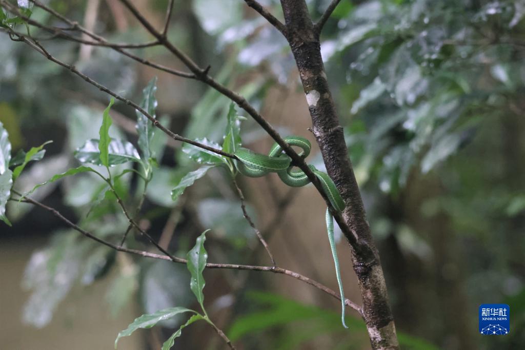 7月24日,在哥斯達黎加蒙特韋德云霧森林生物保護區內,一條側帶棕櫚蝮蛇纏繞在樹(shù)枝上。新華社記者 范小林 攝