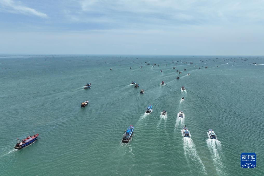 8月16日,漁船從海南省臨高縣新盈港駛向南海(無(wú)人機照片)。新華社記者 張麗蕓 攝