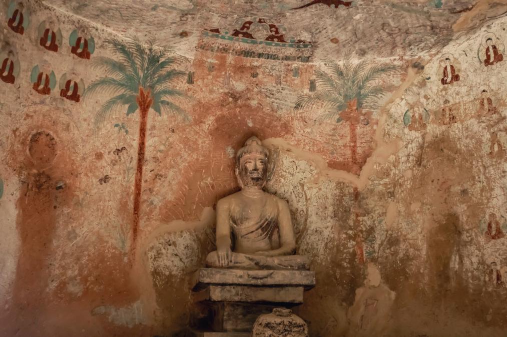 “第11窟開(kāi)鑿于唐代,是一座馬蹄形穹窿頂窟,里面有一主尊石雕造像,身后,兩棵樹(shù)干高大形似南方椰子樹(shù)的壁畫(huà)生動(dòng)可愛(ài),頂部蓮花藻井和飛天彩繪十分精美?!备拭C炳靈寺文物保護研究所講解員楊彩霞介紹,唐代是炳靈寺石窟造像的高峰期,現存三分之二的窟龕雕鑿于這一時(shí)期。