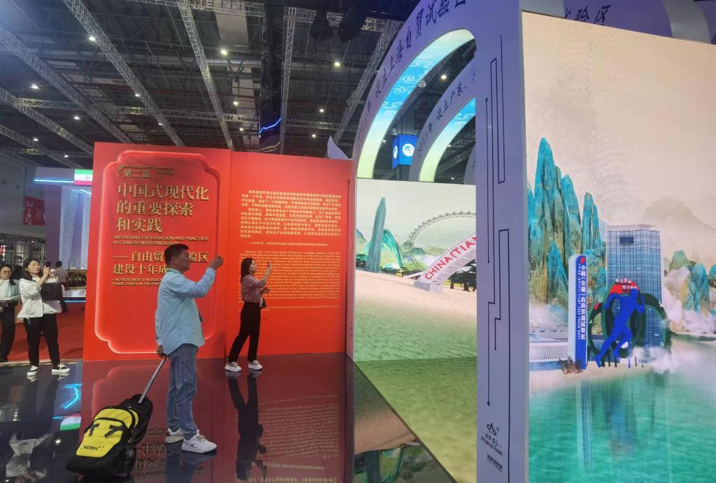 11月6日,觀(guān)眾參觀(guān)自由貿易試驗區建設十年成就展。新華社記者許曉青 攝