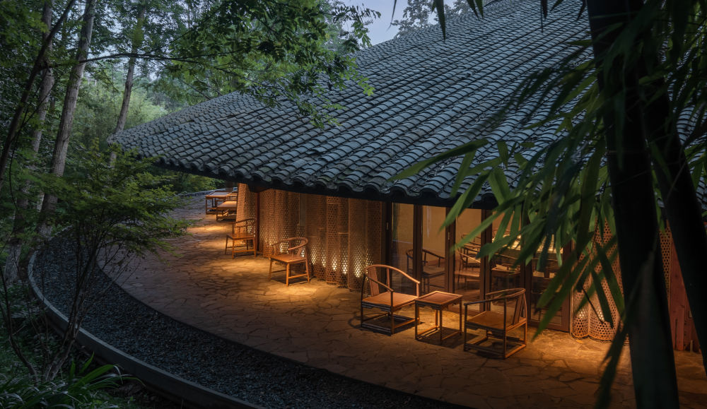 隱于一片竹林之中的“竹里”,是一幢外有野趣、內藏樸拙的現代版川西民居。從空中看,青瓦屋頂形似一個(gè)臥倒的“8”字,交匯圓融。竹編元素被巧妙地蘊于中庭、天井和室內家具之中,輕靈通透。再綴以川式盆景和小徑禪茶,可謂是川西林盤(pán)最美的樣子。