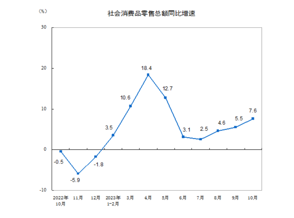 統計數據顯示,10月份,社會(huì )消費品零售總額43333億元,同比增長(cháng)7.6%,增速比9月份加快2.1個(gè)百分點(diǎn)??鄢齼r(jià)格因素,社會(huì )消費品零售總額實(shí)際增長(cháng)8.4%,比9月份加快2.3個(gè)百分點(diǎn)。從月度同比增速看,自8月份以來(lái),社零增速持續加快。