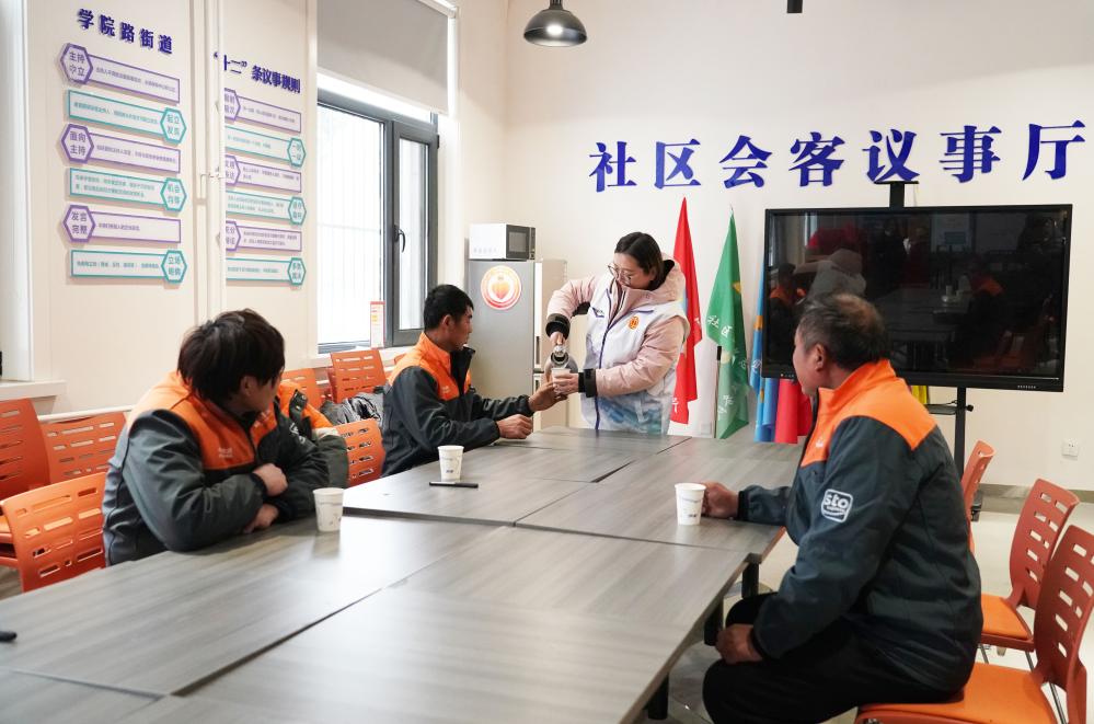 “您好,天太冷了,喝點(diǎn)兒熱水吧!”見(jiàn)到幾位“老熟人”,學(xué)院路街道工會(huì )專(zhuān)職社工趙芷卉倒好熱水,招呼大家坐下取暖。
