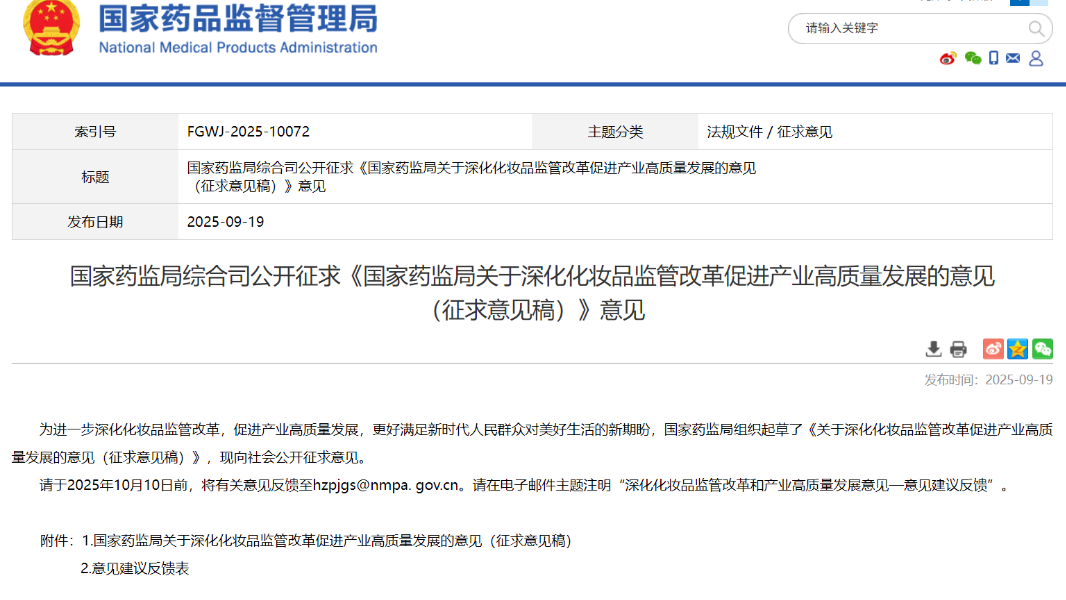 國家藥監局綜合司公開(kāi)征求《國家藥監局關(guān)于深化化妝品監管改革促進(jìn)產(chǎn)業(yè)高質(zhì)量發(fā)展的意見(jiàn)(征求意見(jiàn)稿)》意見(jiàn)