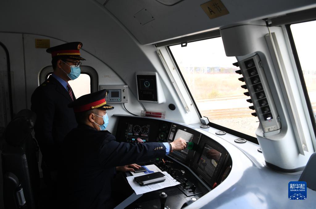 在重慶機務(wù)段興隆場(chǎng)北折返所,中歐班列首發(fā)司機江彤(前)在值乘機車(chē)上做發(fā)車(chē)前的準備(2021年1月28日攝)。新華社記者 王全超 攝