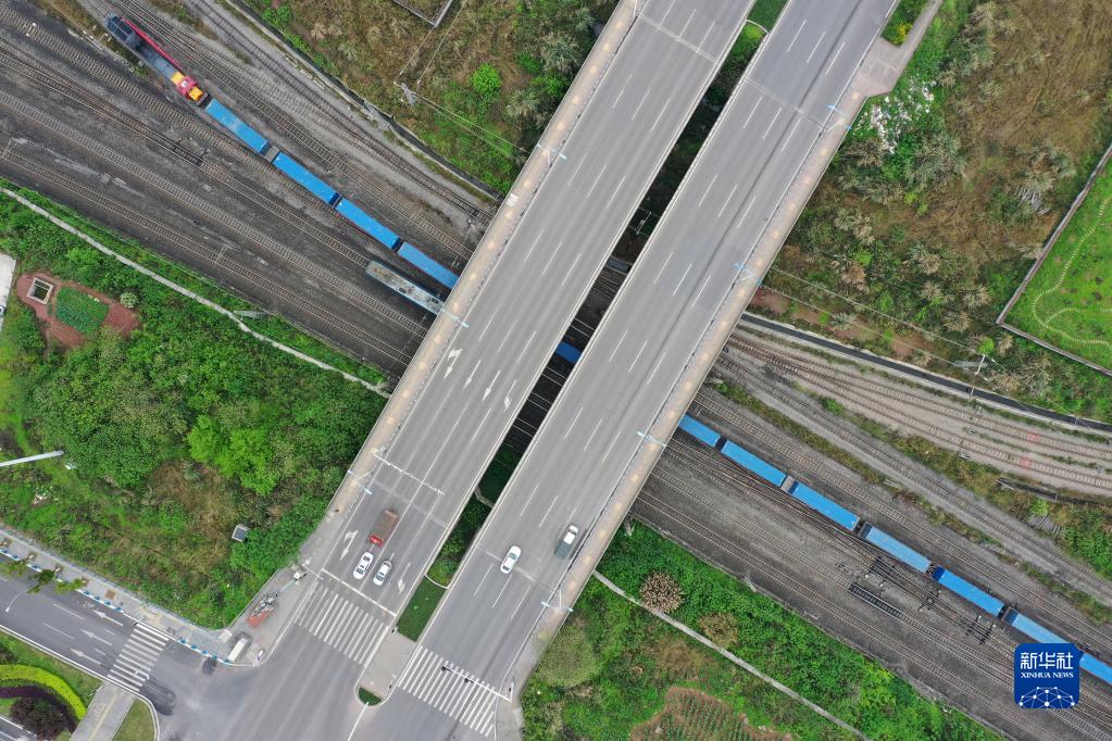 2021年3月19日,中歐班列(渝新歐)十周年紀念專(zhuān)列從重慶一座公路橋下穿過(guò)(無(wú)人機照片)。新華社記者 唐奕 攝