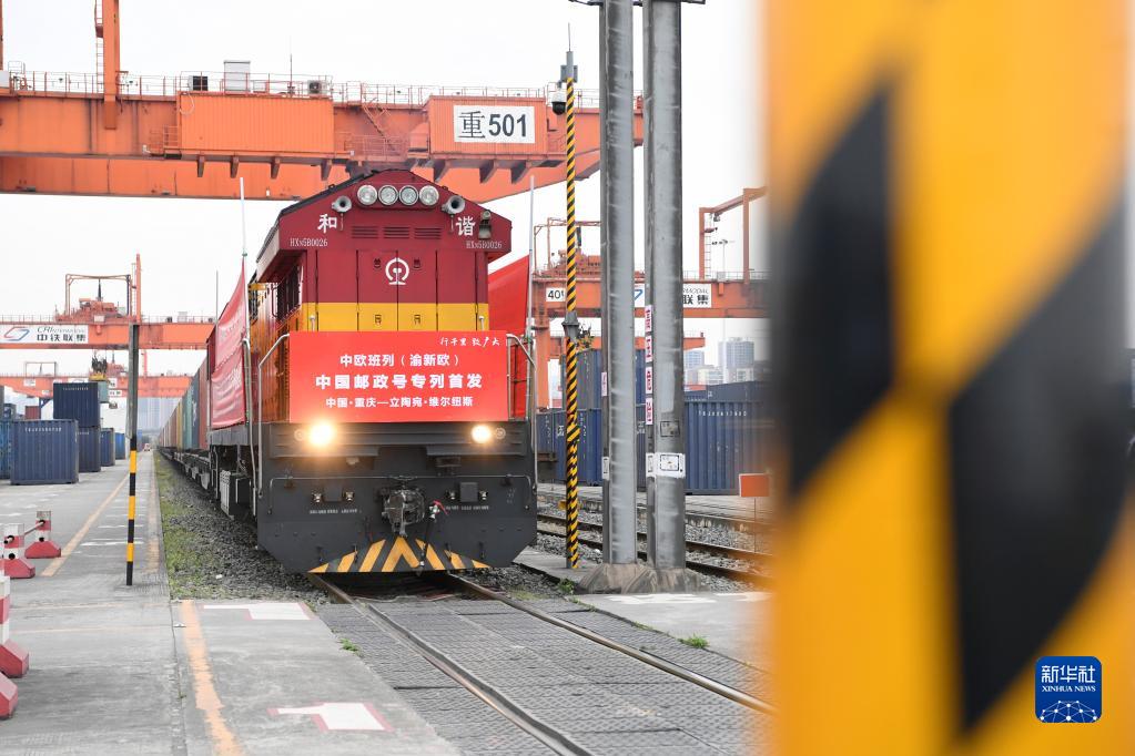 2020年4月3日,中歐班列(渝新歐)“中國郵政號”專(zhuān)列從重慶出發(fā)前往立陶宛。本次列車(chē)共發(fā)運44個(gè)集裝箱,包括來(lái)自北京、廣東、湖南及重慶本地的國際郵件42箱和救援物資2箱。新華社記者 唐奕 攝