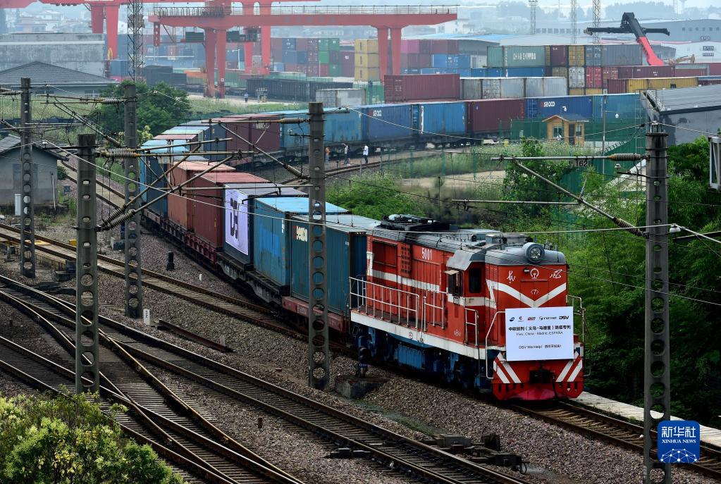 2020年6月5日,滿(mǎn)載防疫物資的“義新歐”中歐班列(義烏-馬德里)在義烏西站啟程,前往西班牙首都馬德里。新華社發(fā)(呂斌 攝)