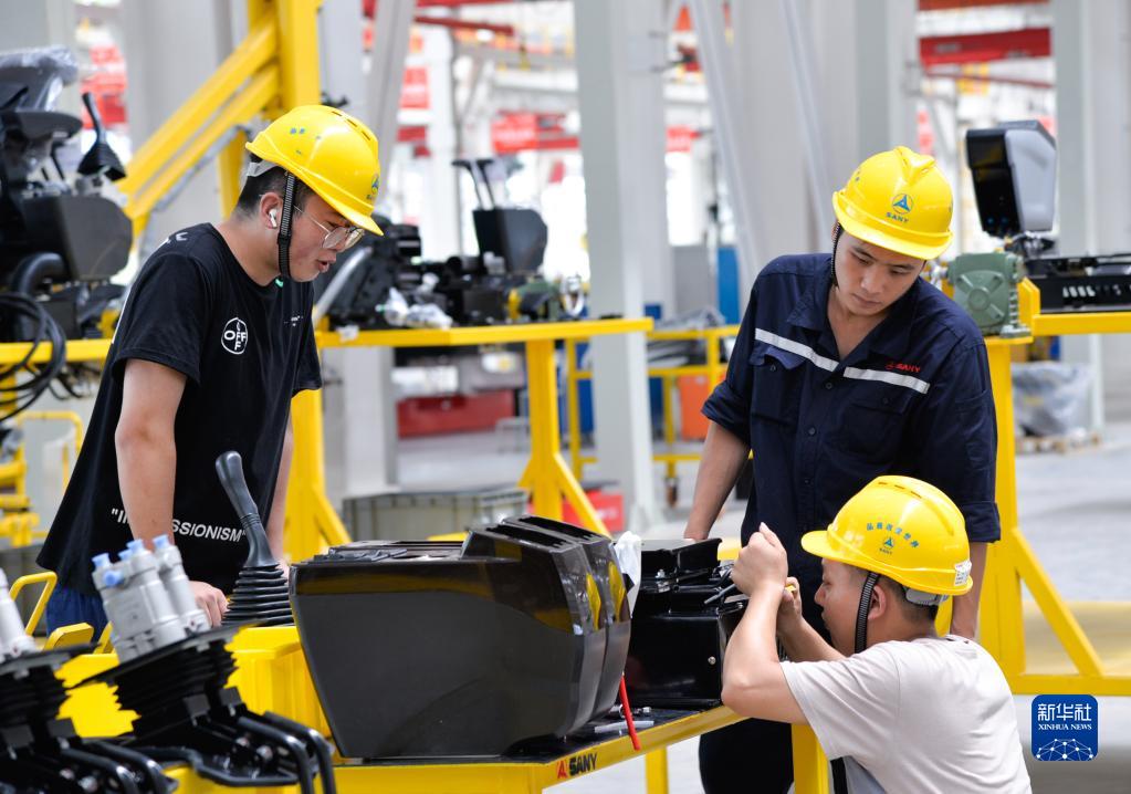 工人在位于重慶兩江新區的三一集團西南地區首個(gè)智能化“燈塔工廠(chǎng)”項目?jì)茸鳂I(yè)(2021年7月19日攝)。新華社記者 徐欽 攝