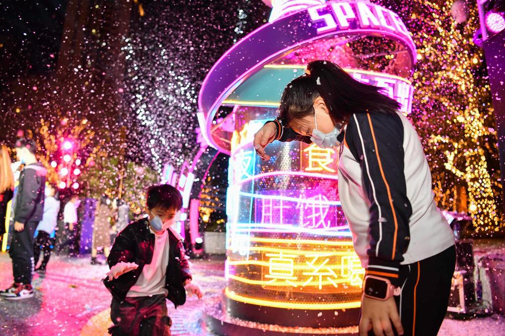 小朋友在廣州夜經(jīng)濟集聚區天德廣場(chǎng)感受人工降雪(資料圖片)。新華社記者劉大偉攝