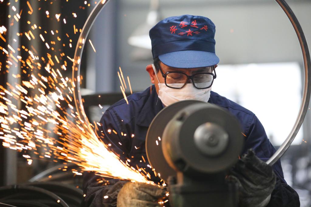 2月7日,在山東煙臺一家工程機械生產(chǎn)企業(yè),工人在生產(chǎn)車(chē)間內忙碌。新華社發(fā)(唐克攝)