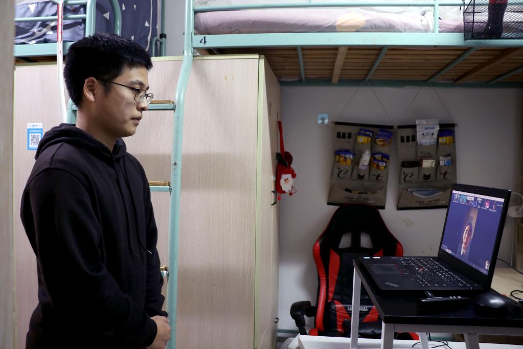 圖為3月30日,上海海洋大學(xué)2022屆畢業(yè)生在宿舍內參加線(xiàn)上面試。新華社發(fā)