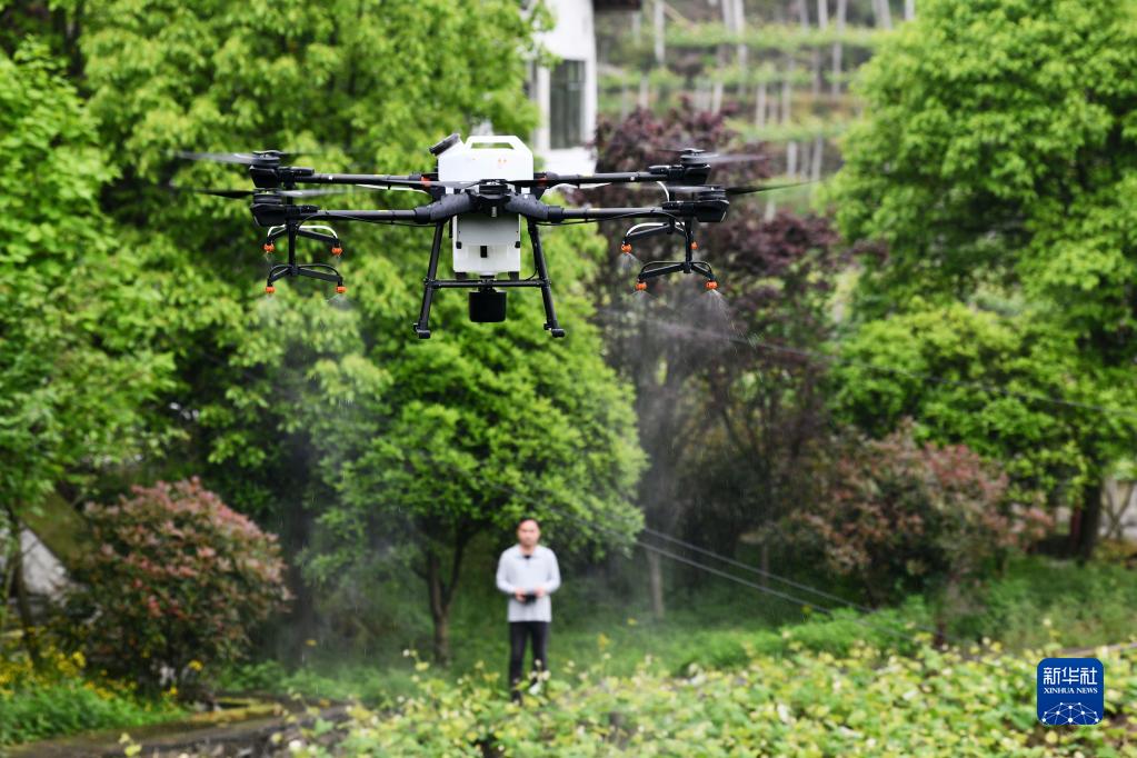 在貴州省貴陽(yáng)市息烽縣小寨壩鎮紅巖村,農技人員在葡萄基地進(jìn)行無(wú)人機植保作業(yè)(2021年4月17日攝)。新華社記者 楊文斌 攝