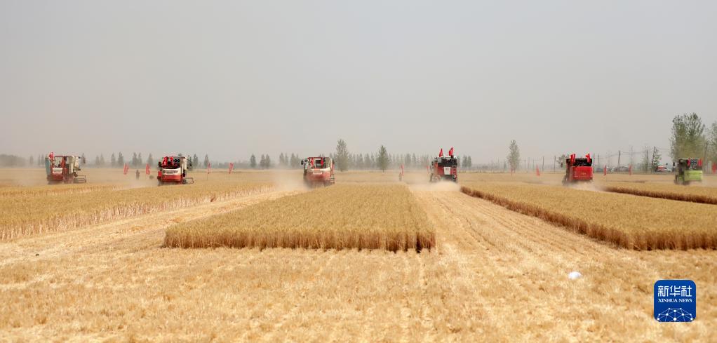 6月2日,在山東省臨沂市郯城縣郯城街道,參加小麥機收減損技能大比武的農機手駕駛收割機收割小麥。新華社發(fā)(張春雷攝)