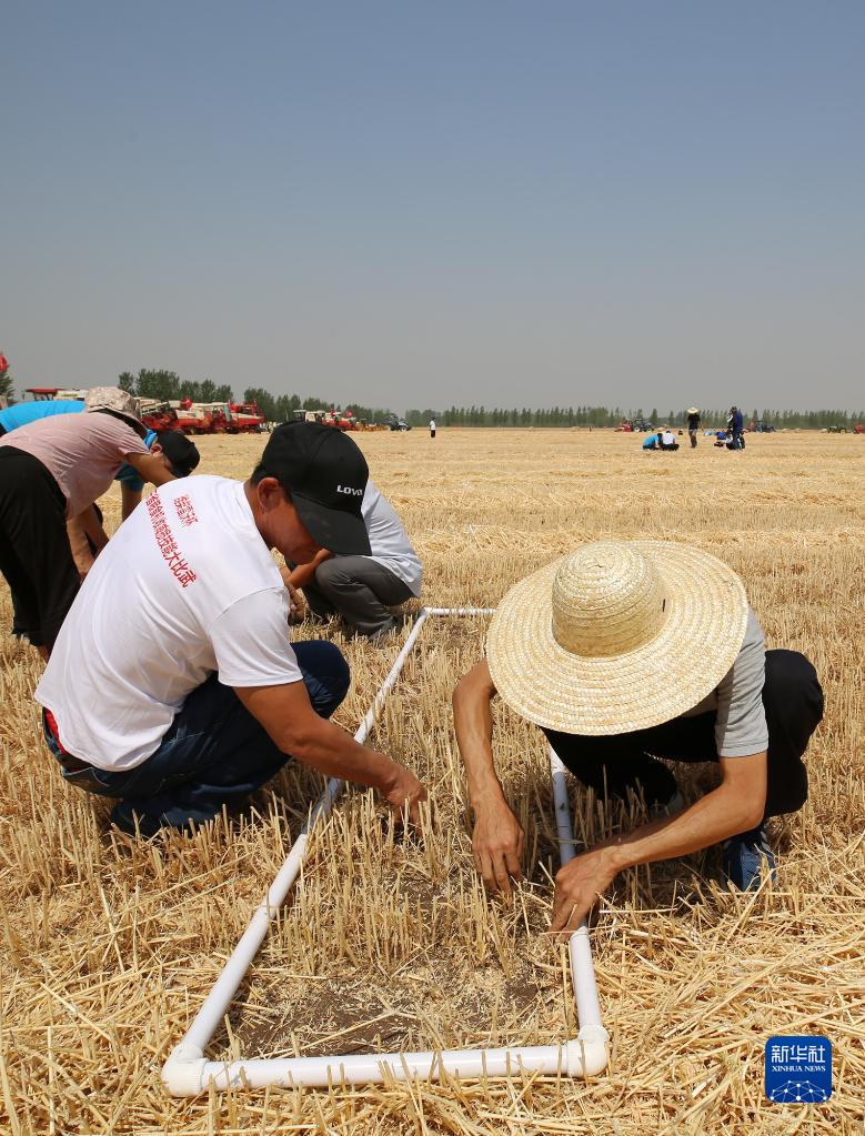 6月2日,在山東省臨沂市郯城縣郯城街道,裁判組工作人員在框取的測評區域之內撿拾麥粒,測算減損率。新華社發(fā)(張春雷攝)