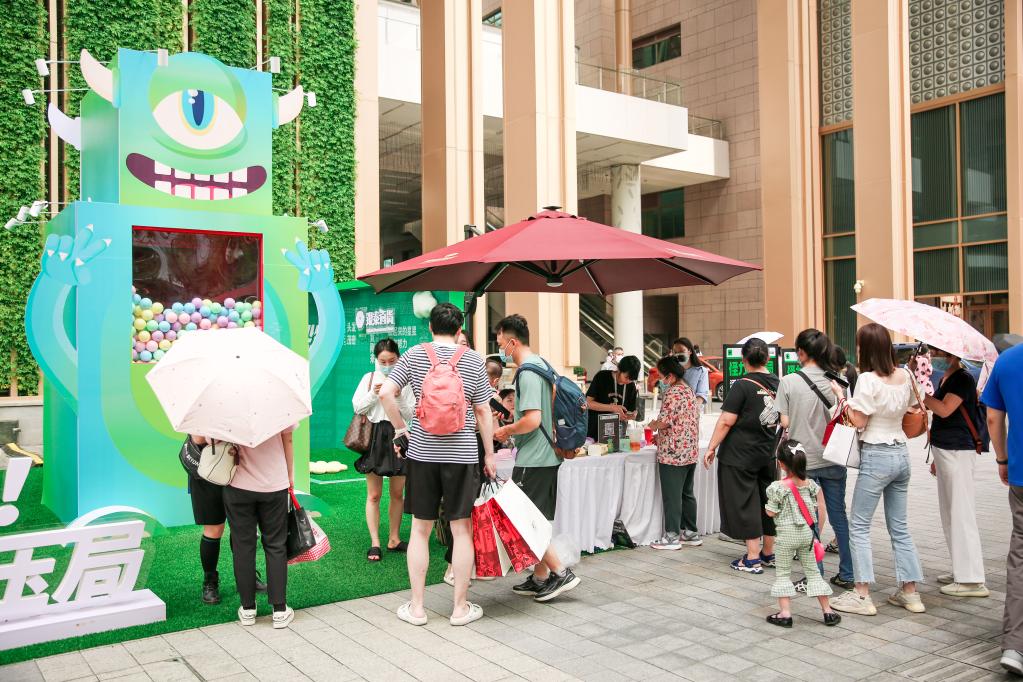 6月16日,位于浙江杭州的銀泰百貨門(mén)前,消費者在商場(chǎng)促銷(xiāo)活動(dòng)中排隊體驗。(新華社記者 張璇 攝)