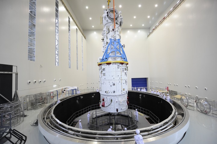 在中國航天科技集團五院天津基地內,天和核心艙在進(jìn)行熱試驗前吊裝(資料照片)。新華社發(fā)(航天科技集團五院供圖)