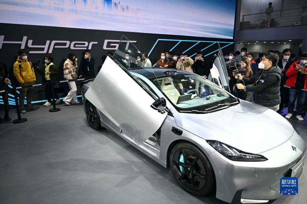 在第二十屆廣州車(chē)展的廣汽埃安展臺,參觀(guān)者觀(guān)看Hyper GT轎跑概念車(chē)(2022年12月30日攝)。新華社記者 鄧華 攝