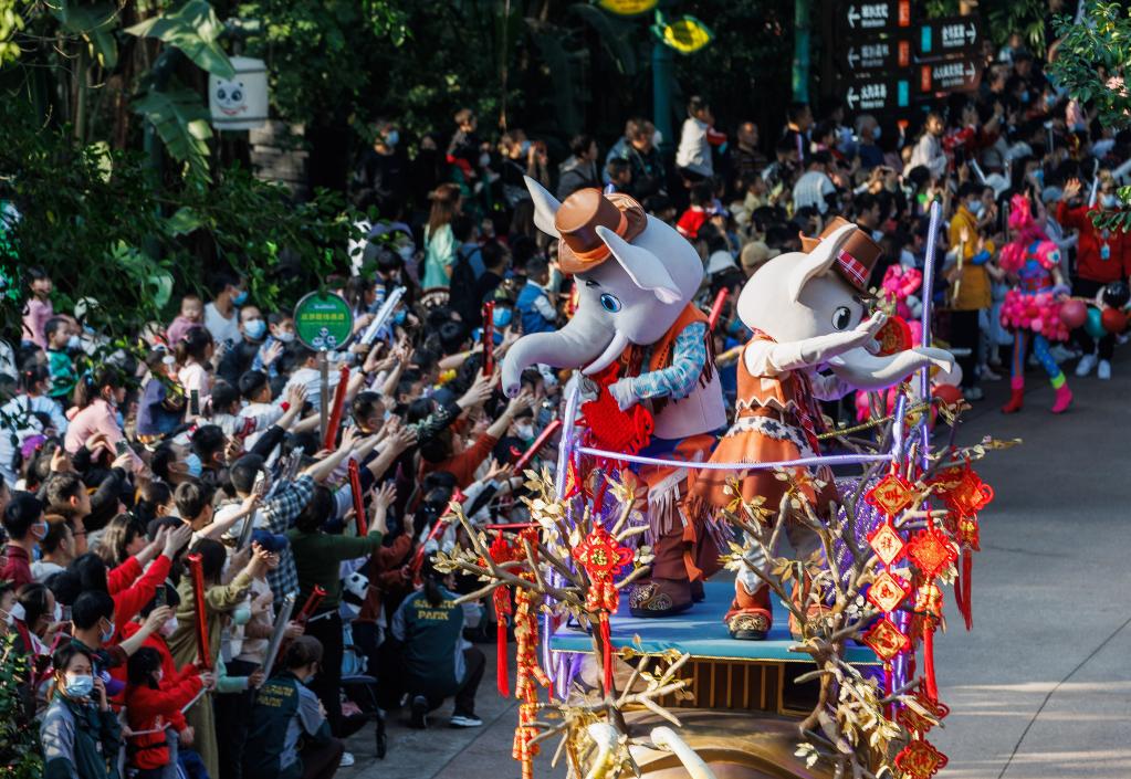 2023年1月22日,游客在廣州長(cháng)隆野生動(dòng)物世界觀(guān)看新年花車(chē)巡游。(新華社記者劉大偉攝)