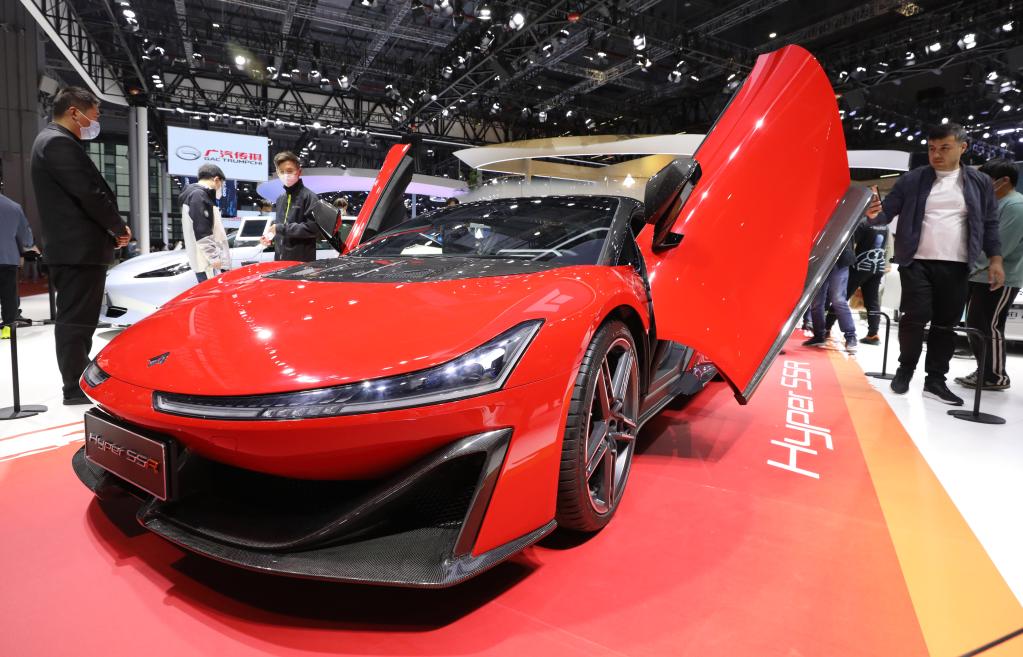 4月24日,第二十屆上海國際汽車(chē)工業(yè)展覽會(huì )上,參觀(guān)者在廣汽傳祺展臺上觀(guān)看一輛昊鉑SSR電動(dòng)跑車(chē)。新華社記者方喆 攝
