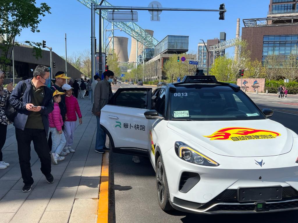 在京無(wú)人駕駛汽車(chē)吸引市民、游客駐足。(新華社記者郭宇靖 攝)