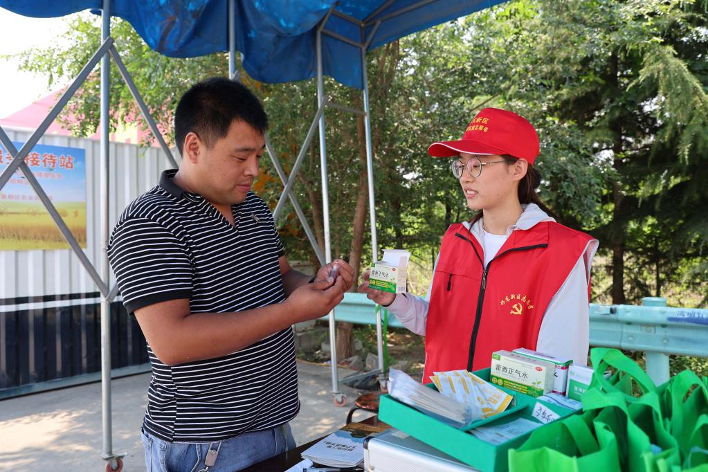 在G4京港澳高速邢臺北口,跨區機收接待服務(wù)站工作人員向農機手發(fā)放防暑物品。新華社記者 鄒尚伯 攝