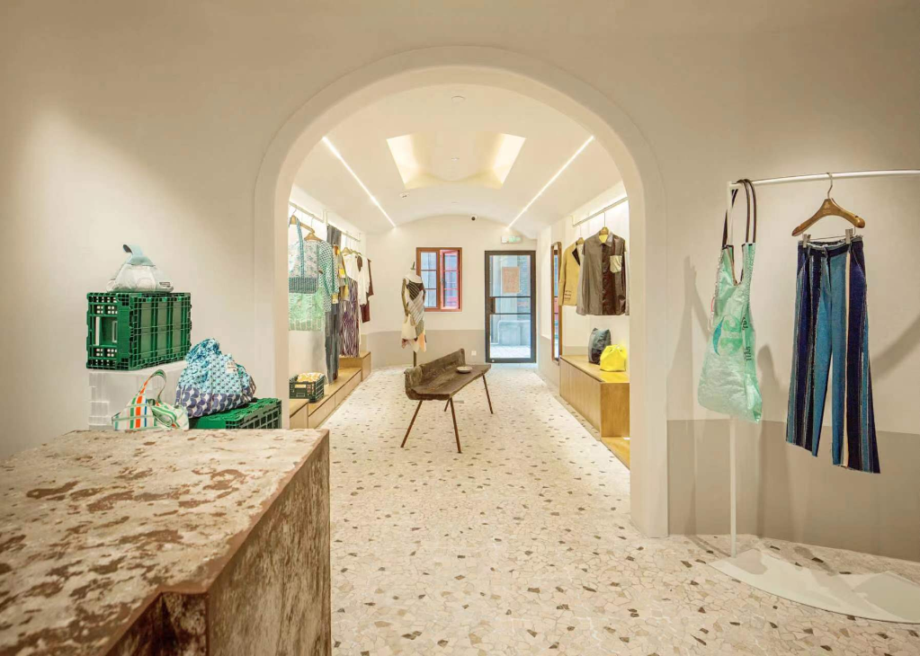 用舊衣料重新拼接設計制作而成的襯衫,用塑料垃圾回收粉碎、環(huán)保再生制成的包包,用農作物廢料和水果殘渣通過(guò)科技再生制成的新潮皮草……在上海北外灘一片百年石庫門(mén)老建筑群里,坐落著(zhù)一家名為“再造衣銀行”的服裝店。