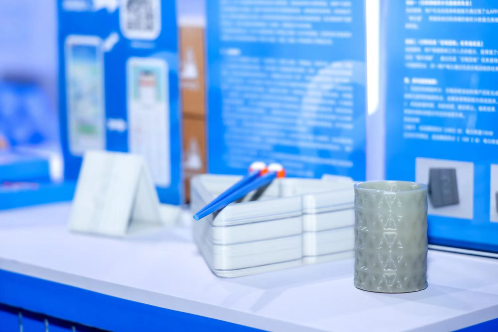 上海碳博會(huì )上展出的用外賣(mài)餐盒回收材料3D打印成的筆筒、收納盒(2023年6月12日攝)。新華社記者王默玲 攝