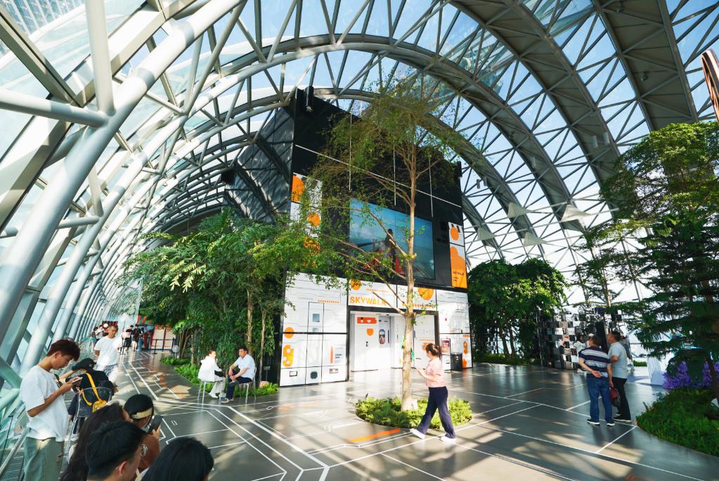 重慶來(lái)福士打造了集購物中心、城市綠肺、交通集散地等功能為一體的綠色商場(chǎng)。裙樓屋頂設有面積達3萬(wàn)平方米的“山城花園”,橫跨4棟塔樓、長(cháng)達300米的水晶連廊里,種植了110多棵高大喬木。這里融合建筑與自然,讓消費者置身綠色舒適的購物休閑空間。