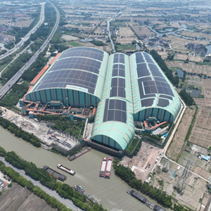 這是江蘇蘇州市常熟市龍騰特種鋼有限公司碼頭料場(chǎng)屋頂光伏(無(wú)人機照片,2023年6月9日攝)。新華社記者 季春鵬 攝