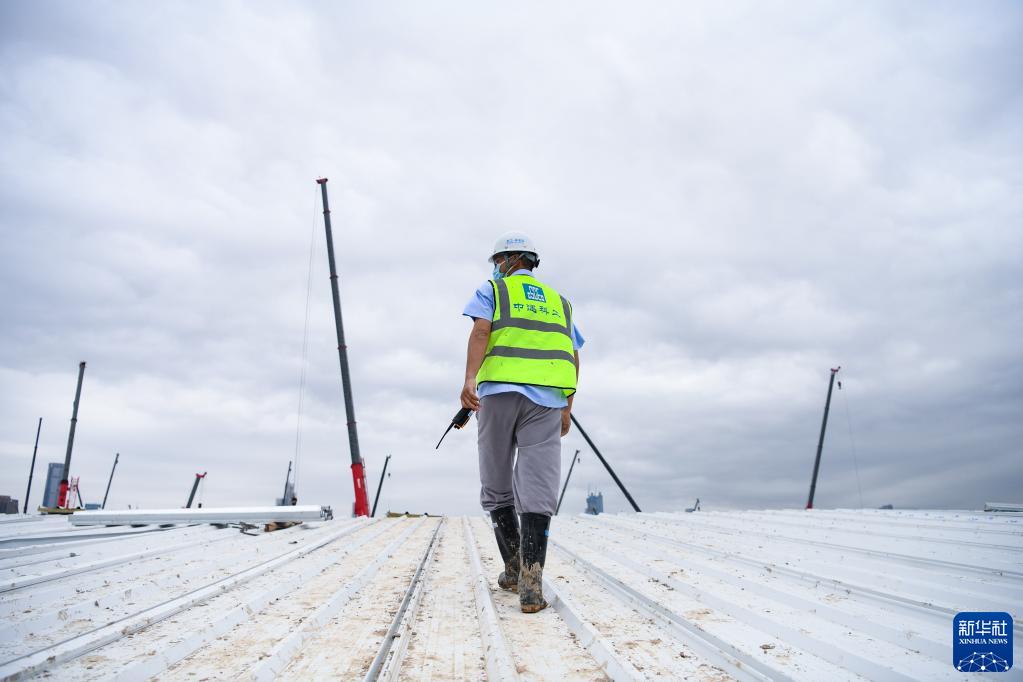 3月27日,一期醫院A1工區長(cháng)李增源在屋頂上察看施工情況。新華社記者 梁旭 攝