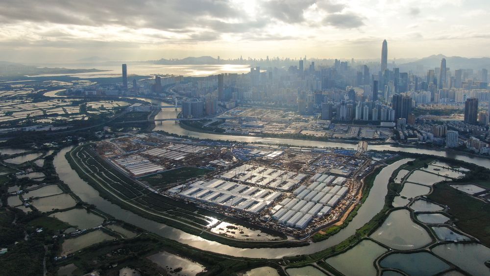 4月3日,夕陽(yáng)下的落馬洲河套地區,中央援港應急醫院如一葉方舟。