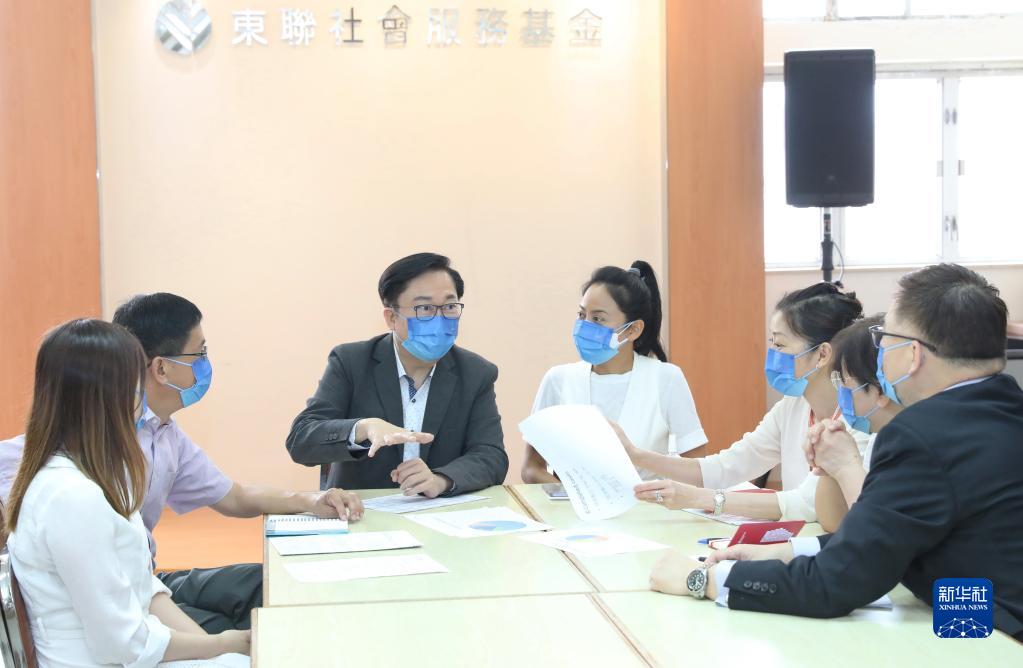 熱線(xiàn)發(fā)起人之一、東聯(lián)社會(huì )服務(wù)基金會(huì )長(cháng)李志峰(左三)在主持會(huì )議,部署“抗逆心聆熱線(xiàn)”團隊下一步的工作(4月29日攝)。 新華社記者 吳曉初 攝