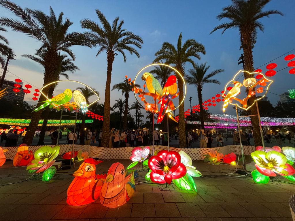 夜幕降臨,香港維多利亞公園的大型燈飾逐漸亮起。高7米的中式帆船造型彩燈,還有鸚鵡、駿馬、鯉魚(yú)等多組不同主題彩燈,璀璨奪目。