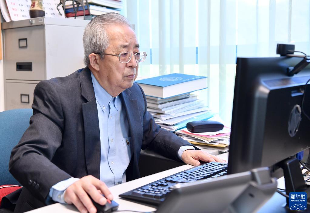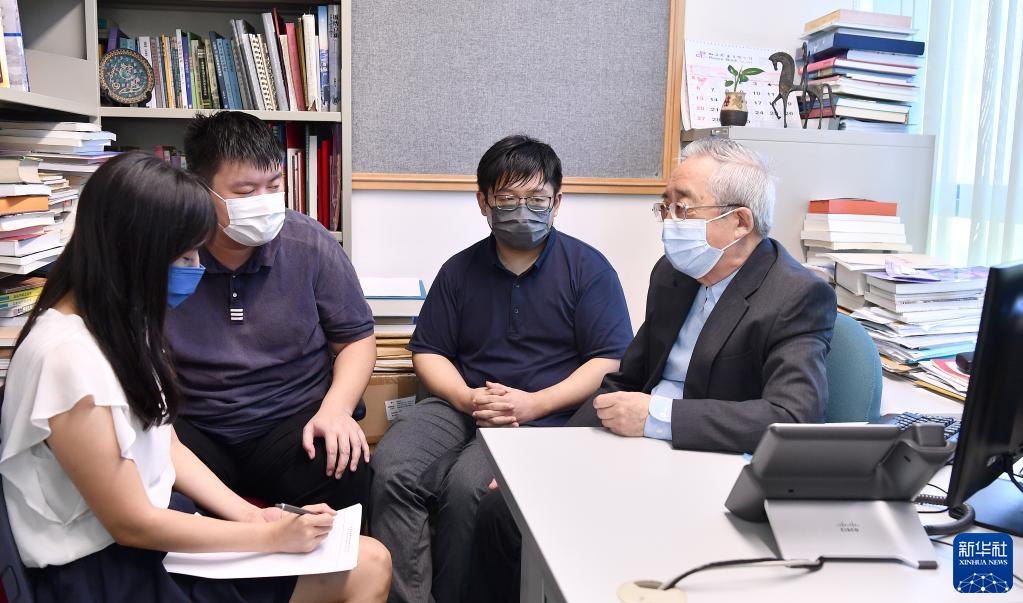11月26日,香港嶺南大學(xué)高級研究員、香港地方志中心事務(wù)顧問(wèn)劉蜀永(右一)在辦公室與助理交流。新華社記者 陳鐸 攝