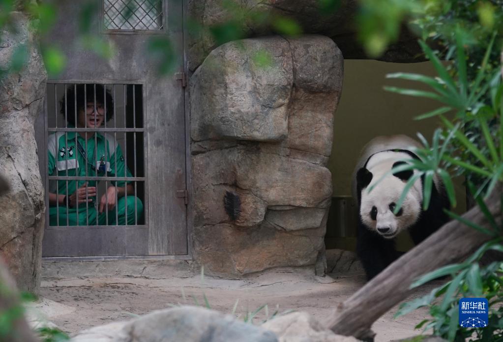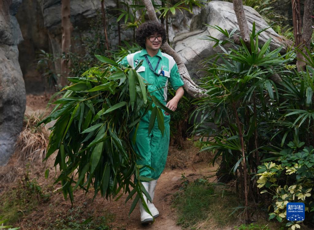 在香港海洋公園,大熊貓“奶媽”胡綺琪在開(kāi)園前做準備工作(4月19日攝)。新華社記者 王申 攝