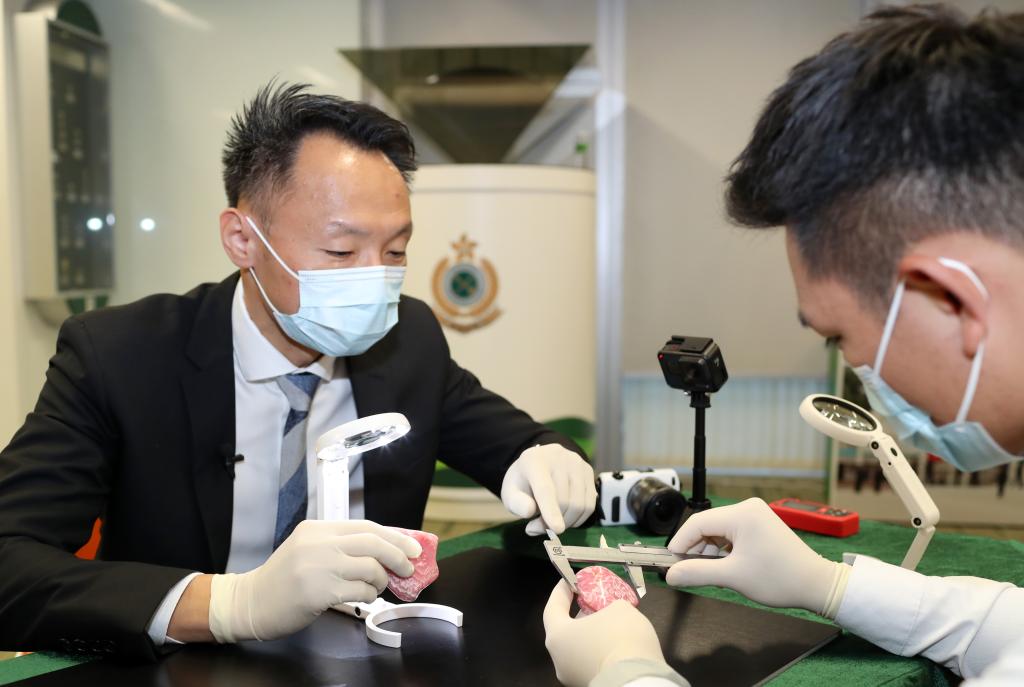 劉玉龍和同事戴著(zhù)口罩和手套,用放大鏡對準一塊玉石細細察看紋理,并對著(zhù)光線(xiàn)反復觀(guān)察;桌面上,一臺特制的微型攝像機無(wú)聲地攝錄著(zhù),紅色指示燈一閃一閃。