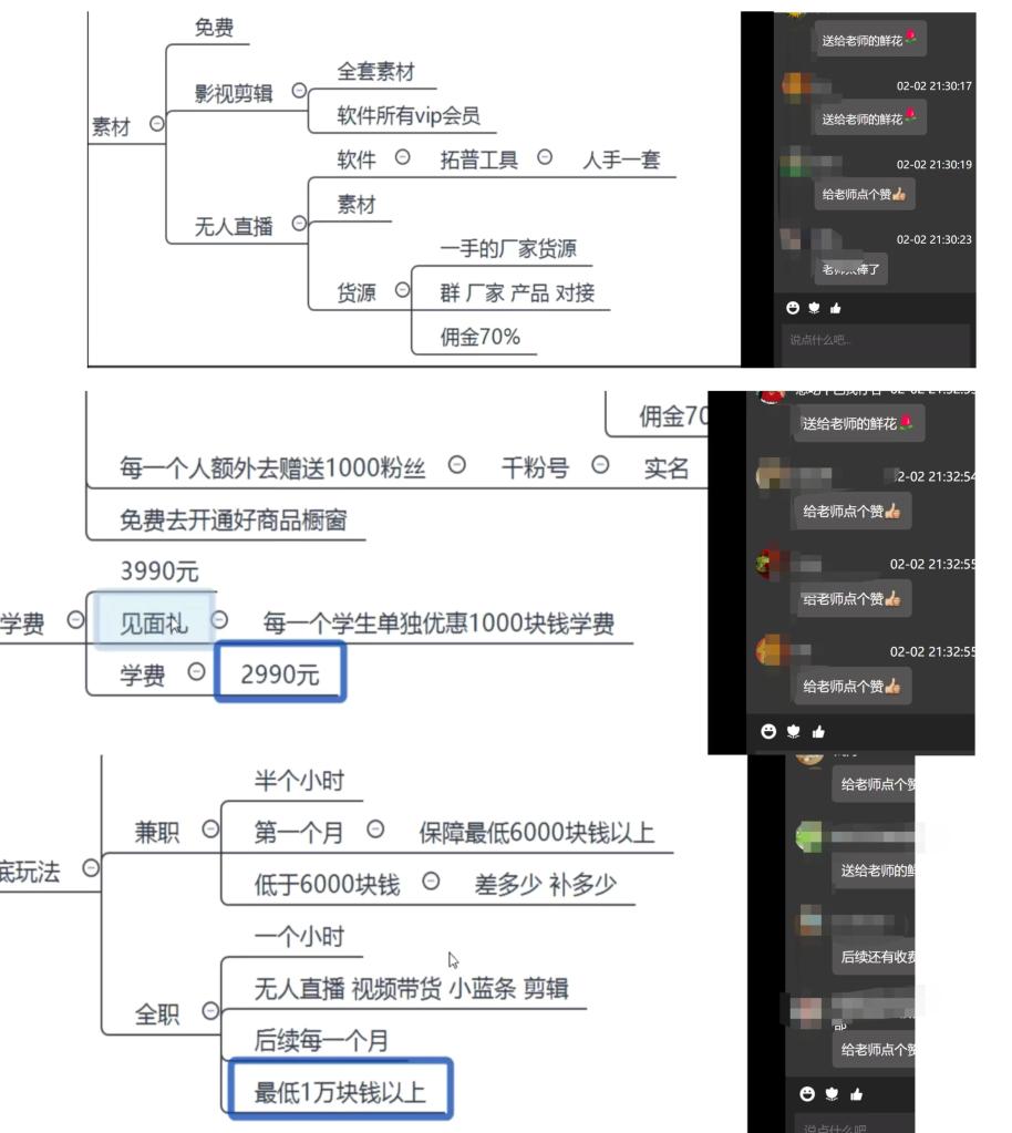 課程快結束時(shí),該“講師”表示可為15位學(xué)員進(jìn)行“一對一”授課,不僅能“手把手”教會(huì )各類(lèi)變現技巧、免費贈送粉絲、對接帶貨貨源,還許諾如果學(xué)員全職從業(yè),從第二個(gè)月起每月收入將不低于1萬(wàn)元,但需要付課程費2990元。有部分學(xué)員付了款。