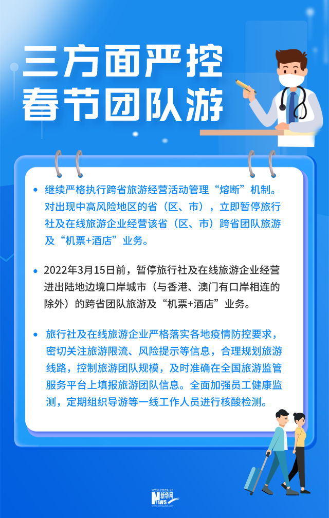 文化和旅游部市場(chǎng)管理司副司長(cháng)余昌國在發(fā)布會(huì )上介紹,12月17日,文化和旅游部辦公廳印發(fā)《關(guān)于加強2022年元旦春節期間旅游團隊疫情防控工作的通知》,要求各地毫不放松、科學(xué)精準做好2022年元旦春節期間旅游團隊疫情防控工作,明確三方面的要求: