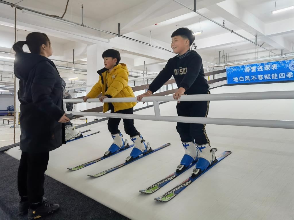 沈陽(yáng)市渾南區第九小學(xué)的小學(xué)生在托管班老師指導下學(xué)習滑雪。新華社記者 王瑩 攝