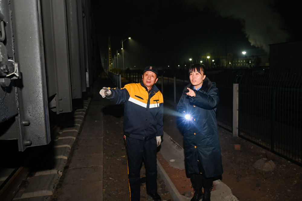 ↑1月20日,在包頭貨運中心大牛地車(chē)間,張芳(右)和同事在查看貨運列車(chē)情況。