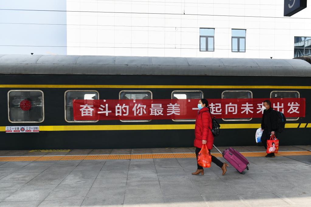旅客在漢中火車(chē)站乘坐務(wù)工專(zhuān)列準備出發(fā)。(受訪(fǎng)者供圖)