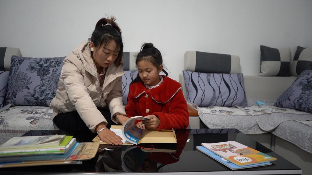 21日晚,尚欣怡和媽媽薛淑琴在新家一起包書(shū)皮。(新華社記者郎兵兵 攝)