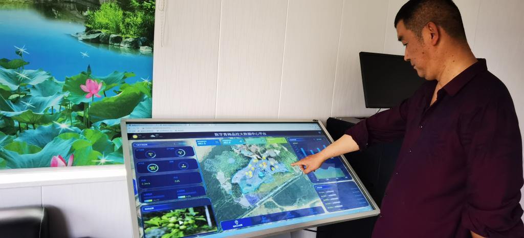 繁昌區荻港鎮桃沖村的數字青梅基地負責人陳勇通過(guò)大數據平臺查看病蟲(chóng)害預警情況。新華社記者王菲 攝