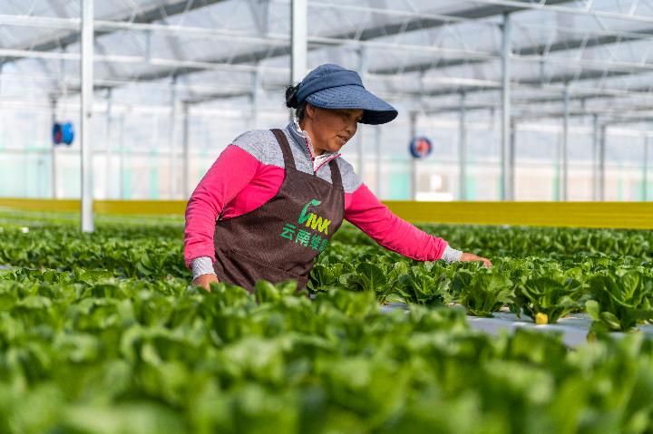 一名縣城易地搬遷安置區居民在會(huì )澤縣農業(yè)產(chǎn)業(yè)示范園蔬菜大棚內打理蔬菜。(新華社記者 陳欣波 3月3日攝)