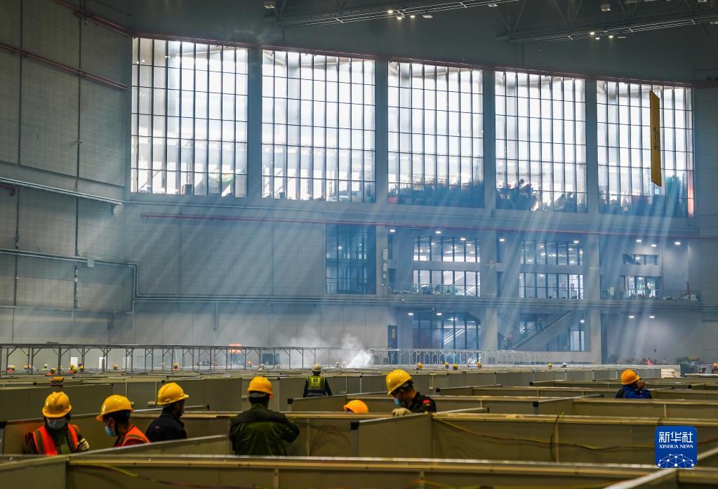 國家會(huì )展中心(上海)展館內,徹夜燈火通明。這里正在建設上海最大的方艙醫院,建成后將提供超過(guò)4萬(wàn)張床位。