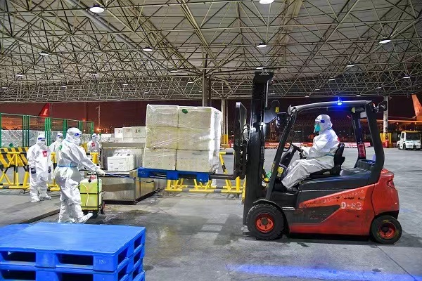 在上海浦東機場(chǎng)貨運區域,7400人封閉作業(yè)。(上海機場(chǎng)集團供圖)